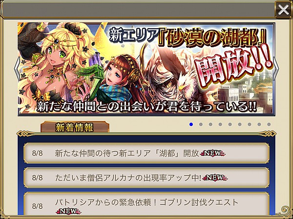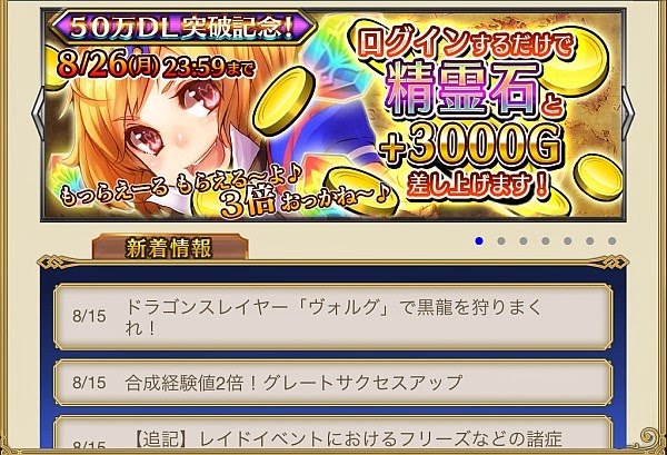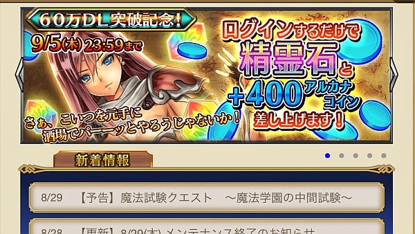 2013年8月30日(金)より60万ダウンロード記念ログインキャンペーンがスタートしました。期間中にログインすると、毎日課金アイテム「精霊石」が1個もらえます。加えてアルカナコインが2倍になるそうです!
