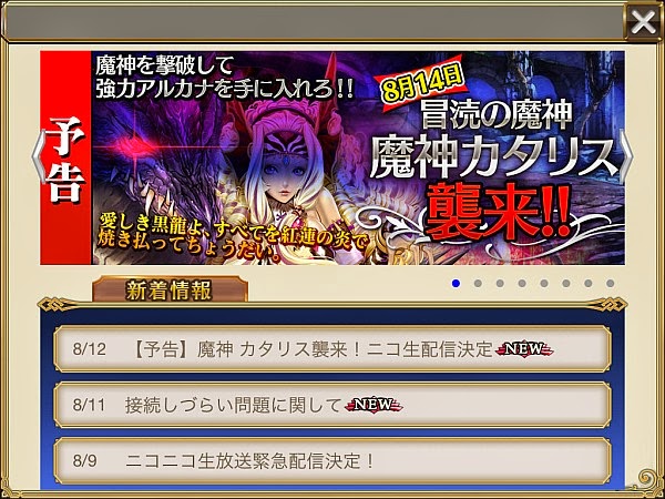 8月14日(水)よりイベント「魔人カタリス襲来!!」がスタートしました。配信開始と同時にオンエアされたニコニコ生放送によると、スタート後、一時間半の間に約80,000人がイベント参加するほどの盛り上がりを見せているようです。