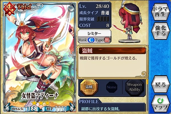 酒場ガチャで稀に良く手に入るマディーナさん、スキルが主人公と同じなのでリングに替えがちだけど、お金稼ぎには最適。うちのパーティではサブメンバーとして、主人公の後釜になってます。