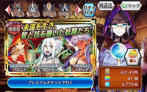 5章3話をクリアすると酒場のある街までたどり着けました。精霊島の酒場ガチャもSSRアルカナは弓使いが二人と、後衛が中心になっています。前回の魔人イベントで貰ったプレミアムチケットで引いてみると・・・