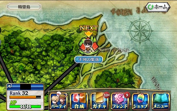 精霊島のマップはうっそうと木々が広がる森林地帯。大きな世界樹を中心にして放射線上にイベントエリアが点在してます。酒場のある街へは上陸した「千河の集落」のストーリークエストをクリアしないと行けないようなので、メインストーリーに挑戦!
