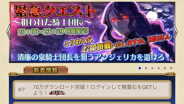 2013年9月6日(金) 17:00より、騎士団クエスト「”清廉の泉”騎士団、出撃!」が配信されました!このイベントはドロップアイテムを集めるタイプのクエストが難易度別に用意されてます。さらに期間限定でクリア型の緊急クエストが発生し、このクエストにクリアするとAランク武器「アサシンブレード」がもらえます。