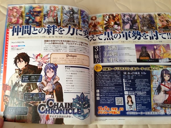 2013年10月28日(月)に発売、KADOKAWA発行の「iPhone & Android 電撃スマホアプリゲーム vol.2」を書店で買ってきました。なぜこのキャラクター達が選ばれたのか謎だけど、表紙のとおり「チェインクロニクル」の特集記事が掲載されてます。