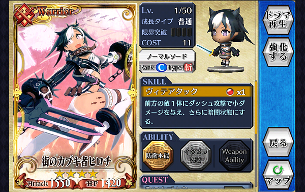主人公の上位互換のスキルを持つ戦士。といっても暗闇状態にしたいのは、敵の魔法使いや弓使いなので、対峙している魔物を暗闇にできたとしても効果はちょっと疑問です。消費マナが1なので、コラボキャラの「ゴトリ」のアビリティ「観察眼(暗闇特効)」へ繋ぐイメージなのかな。