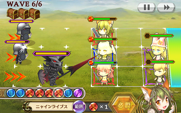 総WAVE数は6、退治する魔物は黒の軍勢です。出現する敵のタイプは騎士タイプがかなり多め、弓使い、魔法使いの遠隔攻撃を半減させます。相手が騎士ならどうするか?ロード画面のTIPSどおり、戦士で攻撃して各個撃破がオススメです。