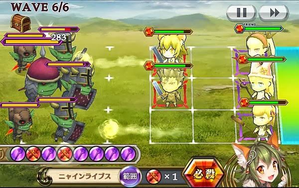 注目していたアルカナ「ゴトリ」をゲットする為に、まずはクエスト「天邪鬼の騎士」を攻略してみました。このクエストは、消費APが12、モンスターレベルは16に設定されていて、曜日クエストと同じ中級難易度となっています。WAVE数は6、魔物はゴブリン軍団です。登場する兵種は、通常WAVEでは魔法使い、弓使い、戦士など、上の画像の高速で移動するゴブリンも現れるので、エンドラインへのタッチダウンには注意です。1列に壁を作って裏を取られないような配置で迎え撃ってください。
